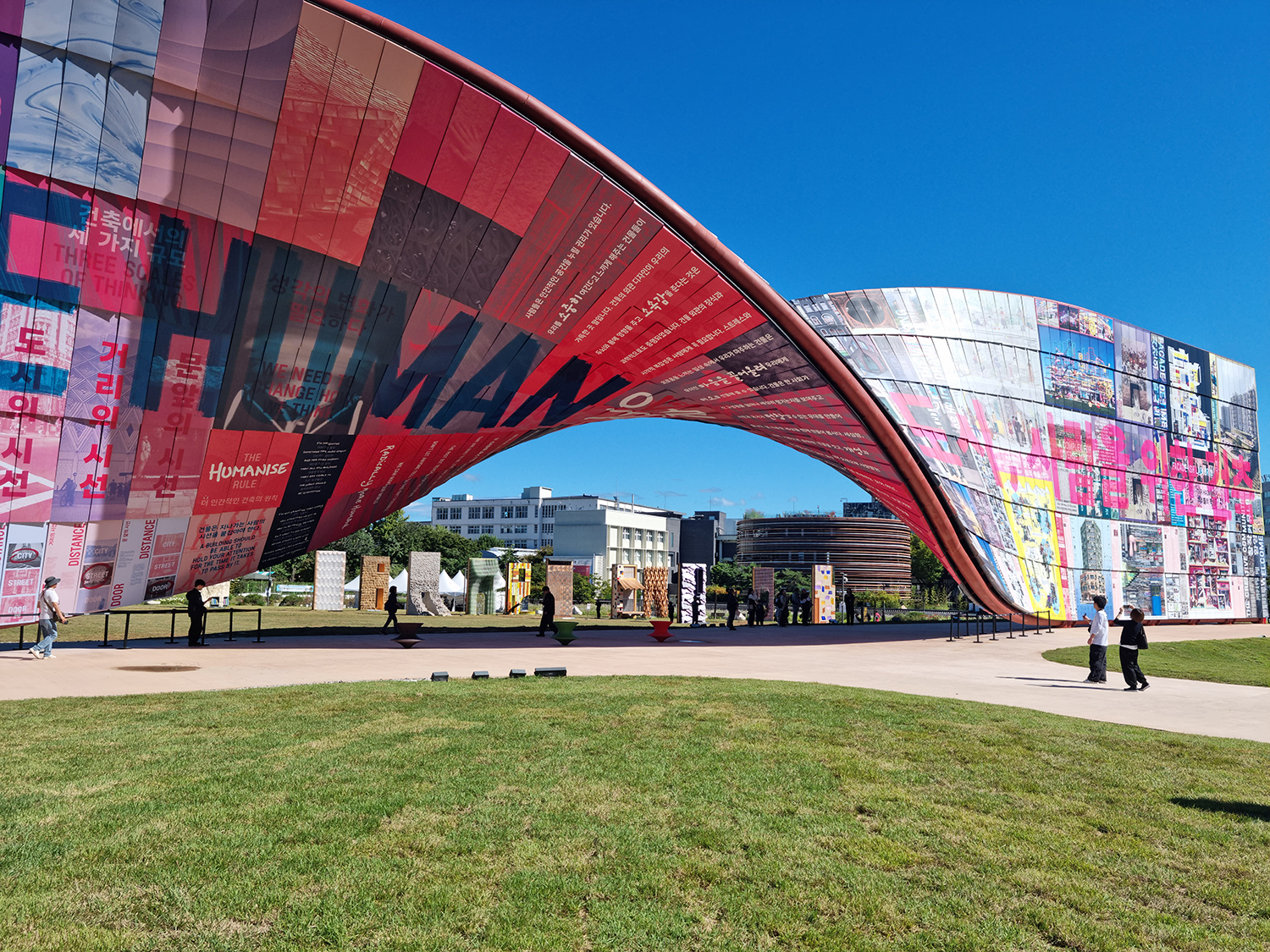 Àü½Ã´Â Å©°Ô ÁÖÁ¦Àü, µµ½ÃÀü, ¼­¿ïÀü, ±Û·Î¹ú ½ºÆ©µð¿À·Î ²Ù·ÁÁ³´Ù. ¸ÕÀú Çì´õÀ¨ÀÌ À̲ö ÁÖÁ¦ÀüÀº ¡®ÈÞ¸Ó³ªÀÌÁî ¿ù¡¯°ú ¡®ÀÏ»óÀÇ º®¡¯ µÎ ºÎºÐÀ¸·Î ³ª´² ¿­¸°¼ÛÇö³ìÁö±¤Àå(ÀÌÇÏ ¼ÛÇö±¤Àå)¿¡¼­ ÆîÃÄÁø´Ù. À̹ø ºñ¿£³¯·¹ÀÇ ÇÙ½É ÀÛǰÀ̱⵵ ÇÑ ÈÞ¸Ó³ªÀÌÁî ¿ùÀº À̸§Ã³·³ °Ç¹°ÀÇ ¿Ü°üÀ» µå·¯³»´Â »ó¡Àû ¿ä¼ÒÀÎ ¡®º®¡¯À¸·Î Á¦¾ÈµÆ´Ù. ±æÀÌ 90m, ³ôÀÌ 16m¿¡ À̸£´Â ö°ñ±¸Á¶¹°¿¡ 1,428ÀåÀÇ °­ÆÇÀ» ºñ´Ãó·³ µ¡ºÙ¿© ¿Ï¼ºÇÑ ÀÌ º®Àº ¸®º»À» ²¿µí °¡¿îµ¥ ºÎºÐÀÌ ºñƲ·Á ÀÖ¾î µÕ±Ù °³±¸ºÎ¸¦ Çü¼ºÇϸç, Àü½Ã°¡ ÆîÃÄÁø ¼ÛÇö±¤ÀåÀÇ ¾È°ú ¹ÛÀ» ¿¬°áÇÑ´Ù. Çì´õÀ¨Àº Àΰ£´Ù¿î µµ½Ã °ÇÃà¿¡ ´ëÇÑ ¸Þ½ÃÁö¸¦ ´ãÀº ÀÌ º®¸éÀÌ »çȸÀÇ º¯È­¸¦ À̲ø¾î³»´Â ¼ÒÅë ⱸ, Áï ¡®´ëÈ­¡¯ÀÇ ½ÃÀÛÀÌ µÉ °ÍÀ̶ó Àü¸ÁÇß´Ù. ÇÑÆí ÈÞ¸Ó³ªÀÌÁî ¿ù ³Ê¸Ó¿¡´Â ...