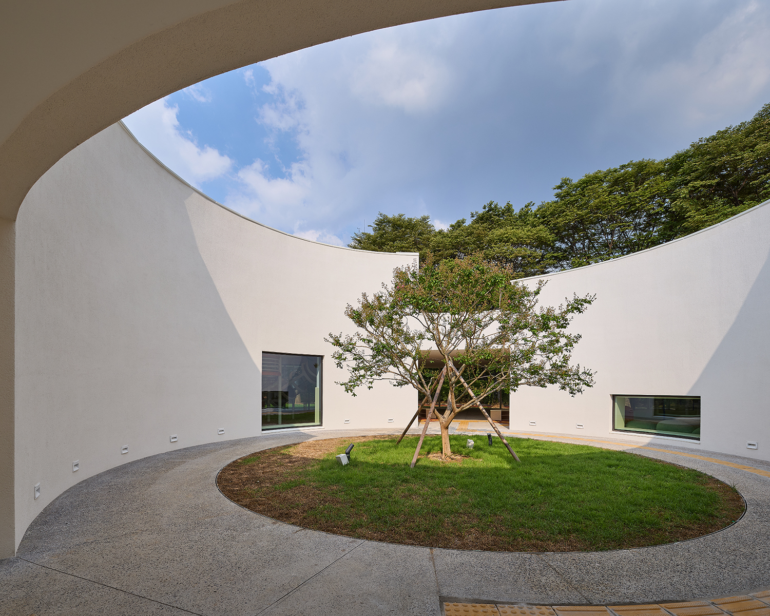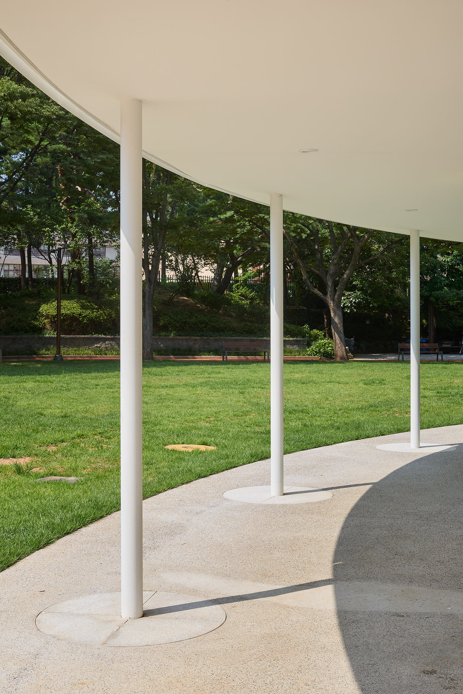 Á¶À±Èñ: ¿¬ÀÇ»ýÅÂÇнÀ°ü(2022, ¡¸SPACE(°ø°£)¡¹ 677È£ Âü°í) ¶§¿Í ¸¶Âù°¡Áö·Î °ø¿ø ¾È¿¡ Áö¾îÁö´Â °Ç¹°ÀÌ ¾î¶»°Ô °ø¿ø°ú ±ä¹ÐÇÑ °ü°è¸¦ ¸Î°Ô ÇÏ´À³Ä ÇÏ´Â ¹®Á¦°¡ ÇÙ½ÉÀ̾ú´Ù. ¼³°è ¼Ò¹¦¿¡´Â ¡®ÀÔ¸é ¾ø´Â °ÇÃ࡯À̶ó°í Ç¥ÇöÇϱ⵵ Çߴµ¥, »ç¹æÀ¸·Î ¿¸° Àܵð¹ç À§¿¡ Áö¾îÁö±â ¶§¹®¿¡ ÀÏÁ¤ÇÑ ¹æÇ⼺À» °®Áö ¾Ê´Â ¿øÇüÀÌ ÀûÀýÇÏ´Ù°í ÆÇ´ÜÇß´Ù. ¸¶½ºÅÍÇ÷£ ¿ø¾È¿¡ ÀÖ´ø Àܵ𸶴ç ÂÊÀ¸·Î Å« ÆÄ³ë¶ó¸¶ âÀ» µÎ°í ±× ¾Õ¿¡ ³ÐÀº 󸶸¦ ³»¾î °Ç¹°ÀÇ ³»¿ÜºÎ°¡ °ø¿ø°ú ÀÚ¿¬½º·¹ À̾îÁö´Â dz°æÀ» »ó»óÇÏ¸é¼ ¸»ÀÌ´Ù.