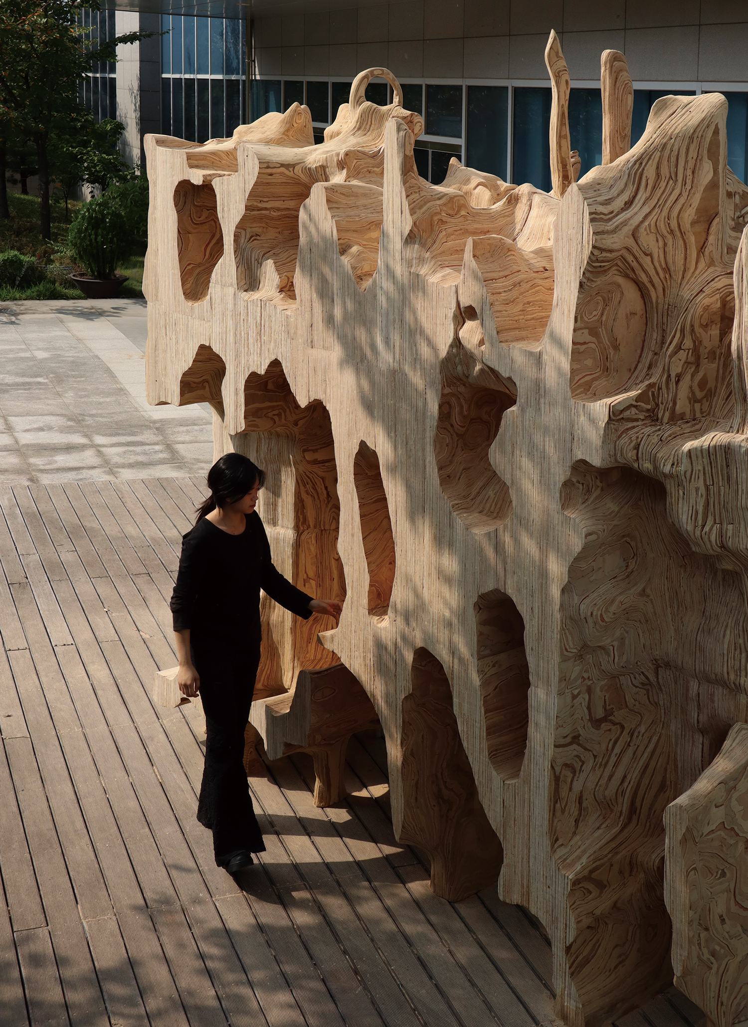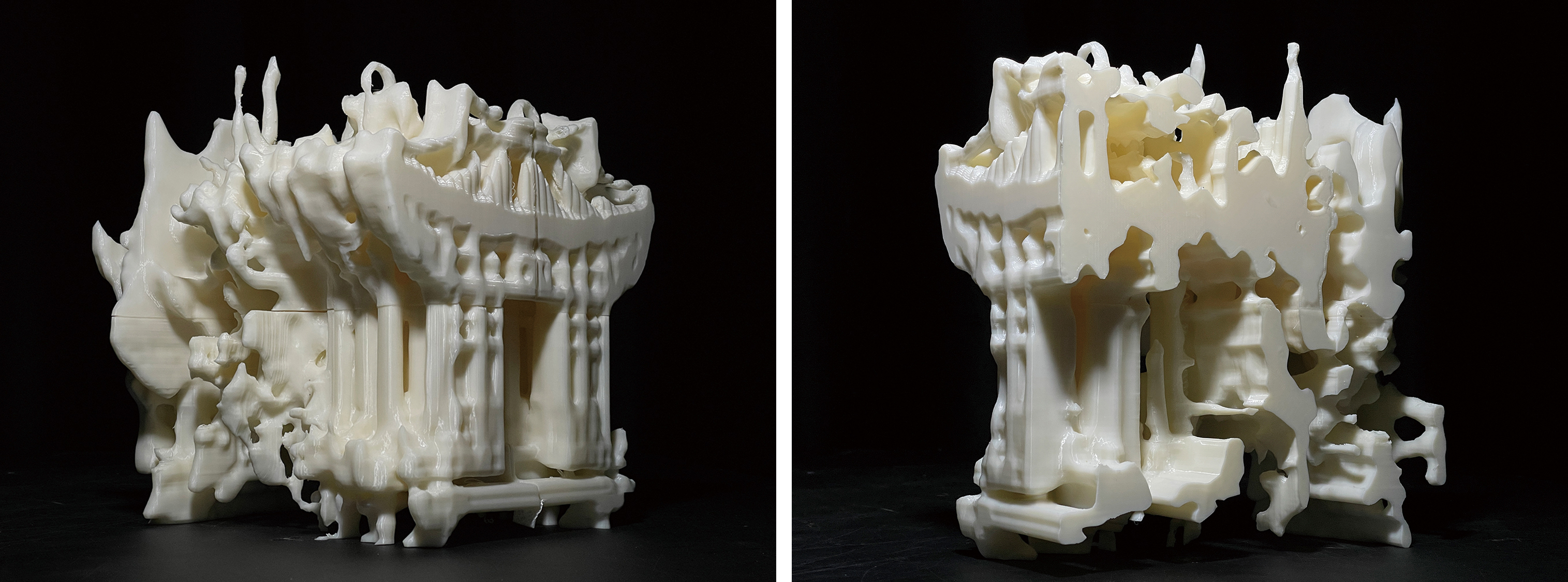 ÀÌ·¸°Ô »ý¼ºµÈ Çü»óÀº ¸ð³î¸®½º¸¦ »ç¿ëÇØ 3Â÷¿ø ¸Å½º ÇüÅÂ(voxel)·Î º´ÇÕµÈ ÈÄ, ½×ÀÎ ´Ü¸é¿¡ ¼öÁ÷ÇÑ ¹æÇâÀ¸·Î Àß¶ó³»¾î ÀÌ È帧À» Á÷Á¢ÀûÀ¸·Î º¸¿©ÁÖ´Â »õ·Î¿î ´Ü¸éÀÇ Çü»óÀ» µå·¯³½´Ù. ÃÖÁ¾ÀûÀ¸·Î 6Ãà ·Îº¿ÆÈ·Î ÃÑ 72Á¶°¢À» ¹Ð¸µÇÑ ÈÄ Á¶¸³ÇØ ½ÇÁ¦ ±¸Á¶¹°·Î Á¦À۵Ǿú´Ù. ÀÌ ¹°¸®Àû ±¸ÇöÀº ´Ü¼øÇÑ °¡°øÀÌ ¾Æ´Ï¶ó, µðÁöÅÐ µ¥ÀÌÅÍ·Î »ý¼ºµÈ À§»óÀû ±¸Á¶¸¦ ¸ñÀç¶ó´Â Àç·á ¾È¿¡ Àû¿ëÇØº¸´Â ½ÇÇèÀ̾ú´Ù. À§»óÇÑ¿ÁÀº ÀüÅë°ÇÃàÀÇ ¿ÜÇüÀ̳ª Àå½ÄÀ» º¹Á¦ÇÏ·Á ÇÏÁö ¾Ê´Â ´ë½Å, °ø°£À» ÀÌ·ç´Â ´Ü¸éÀÇ È帧, °î¼±ÀÇ ¿¬°á¼º, ±¸Á¶ÀÇ ¸®µë°ú °°Àº ºñ°¡½ÃÀû ¿ä¼Ò¸¦ À§»óÀû °üÁ¡¿¡¼ ´Ù½Ã ±¸¼ºÇغ»´Ù. ¿©±â¼ AI´Â ´Ü¼øÇÑ µµ±¸°¡ ¾Æ´Ï¶ó, ÀüÅëÀ» »õ·Ó°Ô ±¸¼ºÇϰí ÀüȯÇÏ´Â ÇϳªÀÇ ´Éµ¿Àû ¼³°è ÁÖü·Î ÀÛµ¿ÇÑ´Ù.
